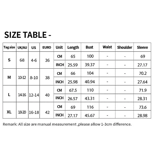 | Size | Fit US Size | Fit UK Size | Fit EU Size | Bust | Sleeve | Length |